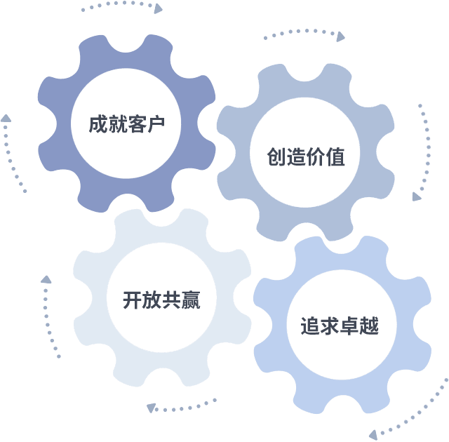 成就客户是一切决策的出发点,,,创造价值是衡量所有工作的标准,,,,追求卓越是我们做事做人的态度,,开放共赢是我们的格局也是最终的结果。。。。价值观的齿轮环环相扣,,推动着组织里的每个人不断向前。。。